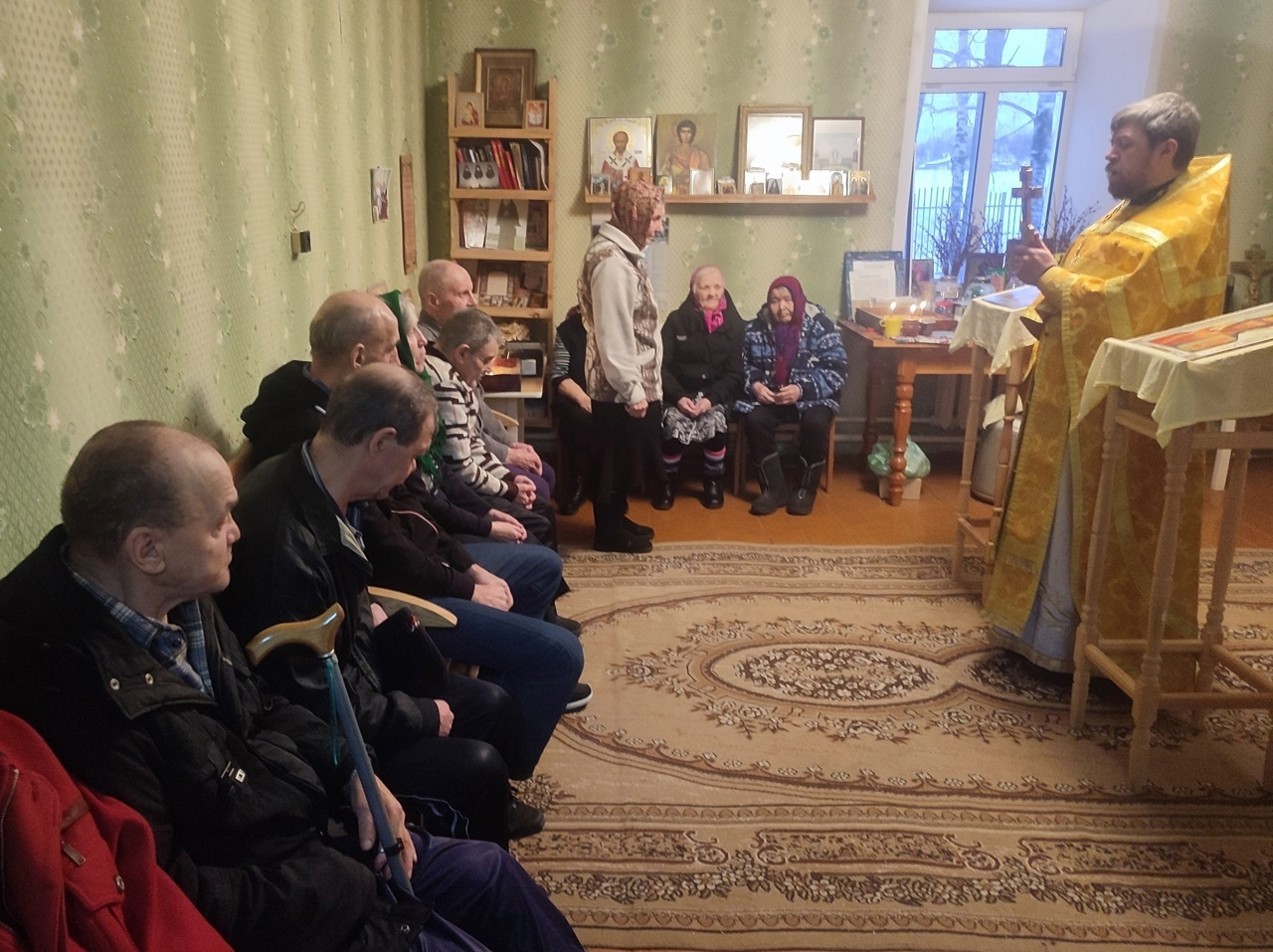 Проживающие собрались на богослужение в молельной комнате. Пожилые люди смогли в очередной раз помолиться во время церковной службы и причаститься Святых Христовых Тайн.